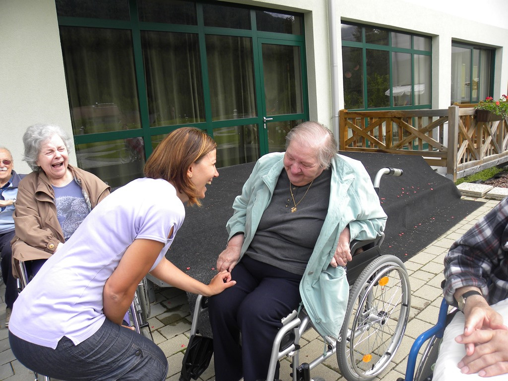 Ura joge smeha je, po pričakovanjih, aktivnost, ki je s strani stanovalcev, zelo dobro obiskana. Ker se radi gibamo na svežem zraku, smo se smejali kar na našem dvorišču.