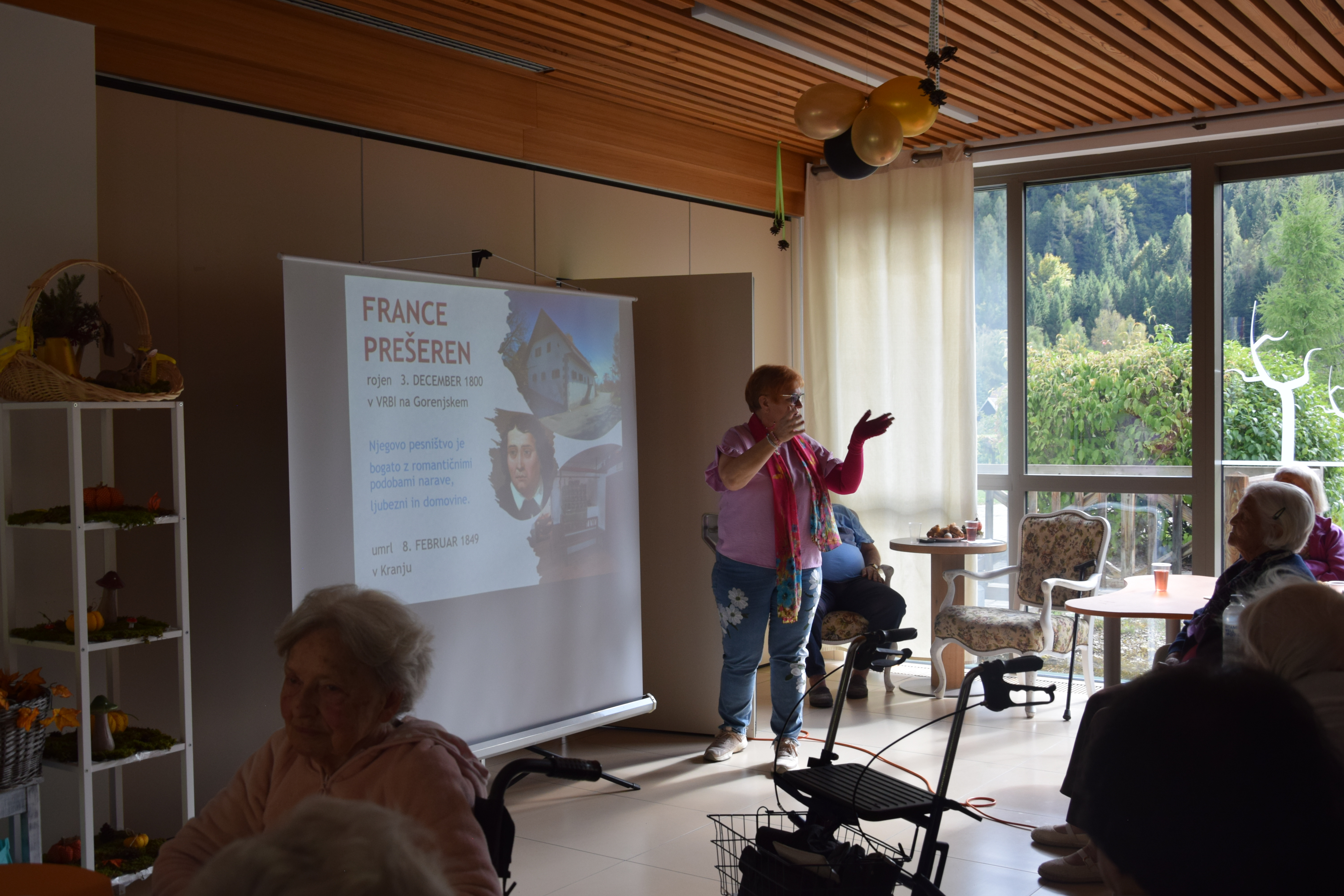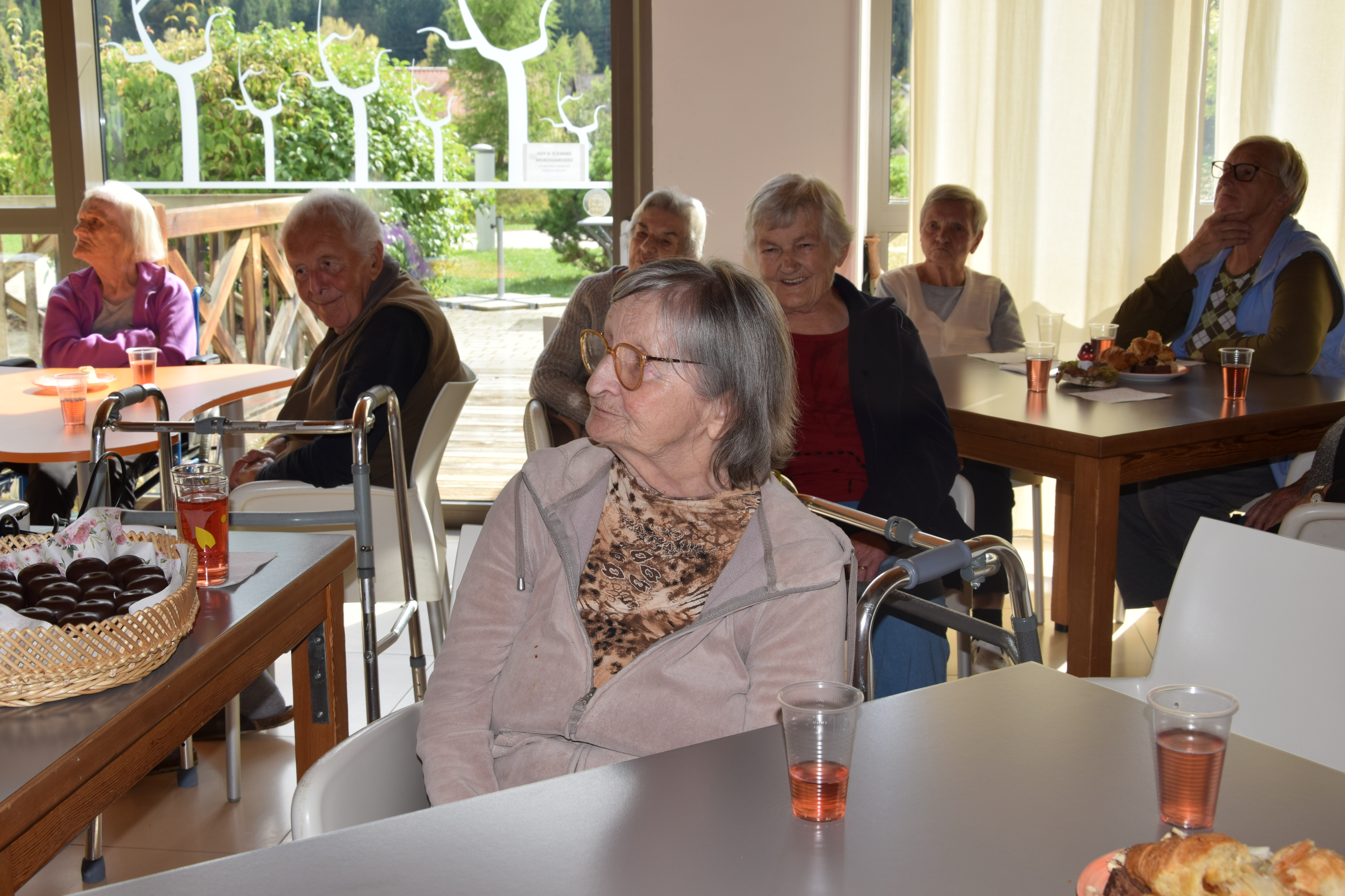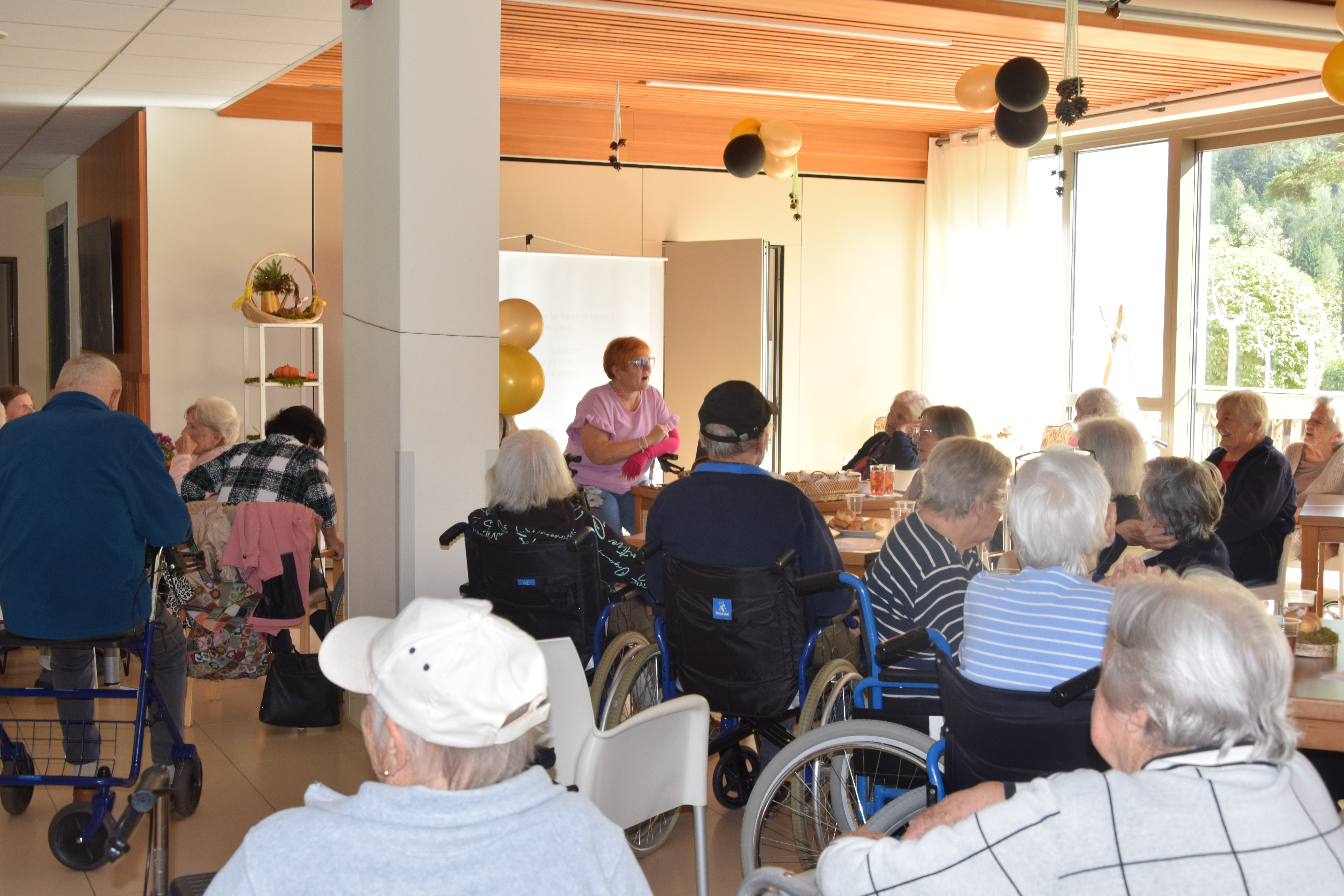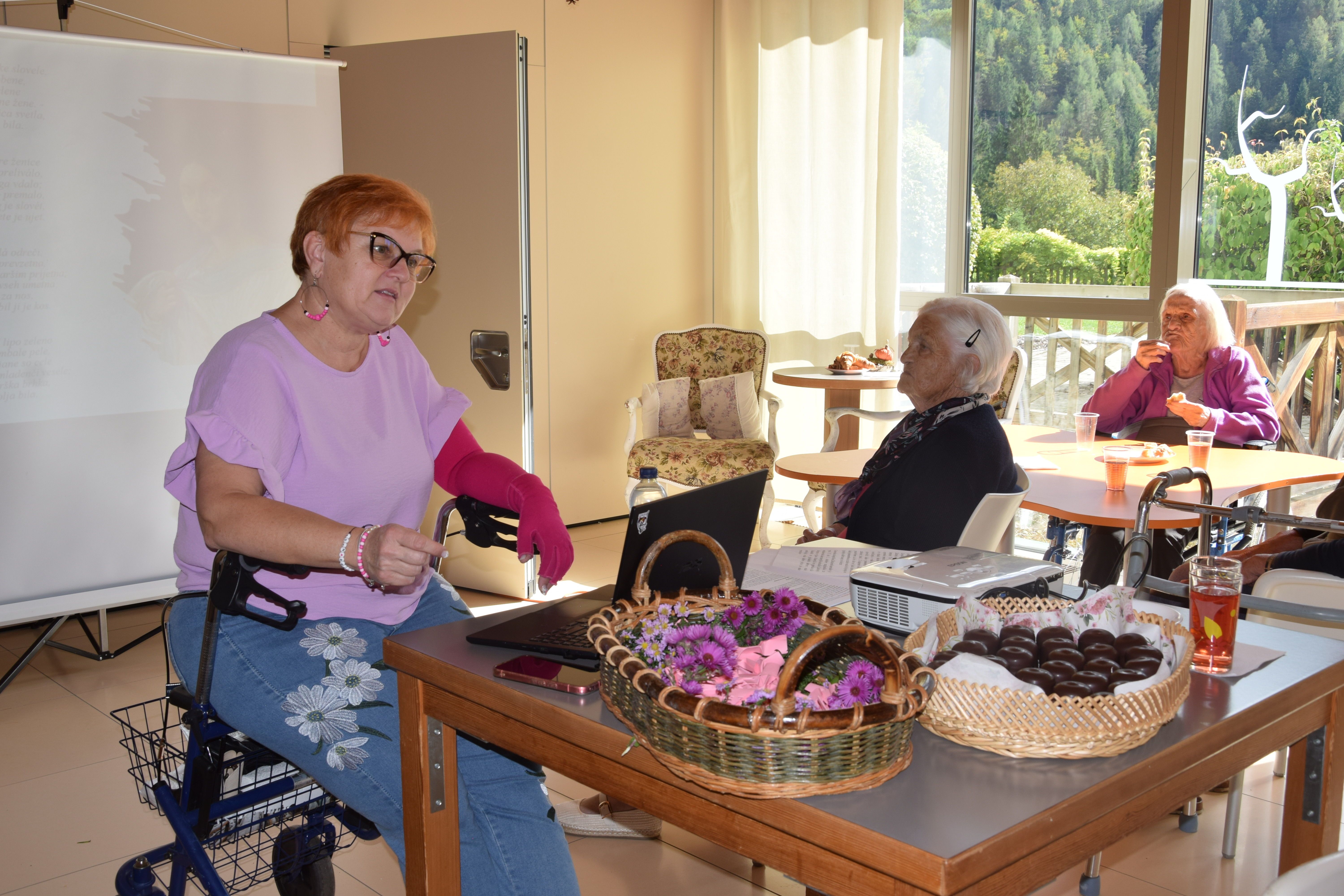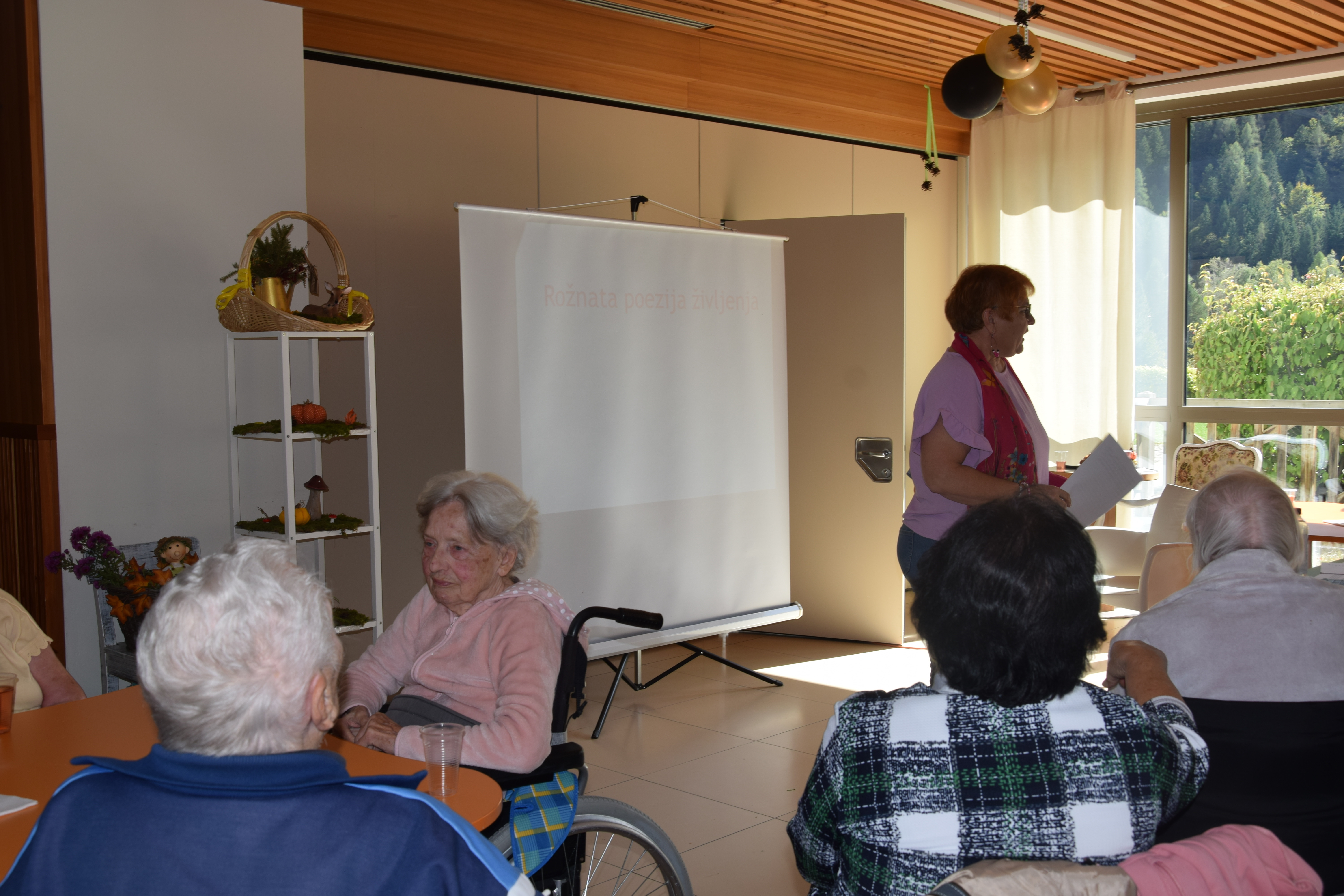 Ob mednarodnem dnevu starejših smo se, kot dom poklonili stanovalcem z lepimi mislimi nato pa smo sredino popoldne nadaljevali z predavanjem ga. Alenke Mirtič Dolenc, ki je za temo izbrala Rožnato poezijo. Predavanje je spremenila v diskusijo s stanovalci, deklamirali so različne pesmi Franceta Prešerna, Simona Jenka in Toneta Pavčka. Nekaj pesmi smo skupaj tudi zapeli. Stanovalci so bili nad aktivnim nastopom ga. Alenke zelo zadovoljni, na koncu pa jih je še pogostila z kavico in indijančki. Dogovorili smo se, da se bomo bolj pogosto srečevali na podobnih in še lepših dogodkih.